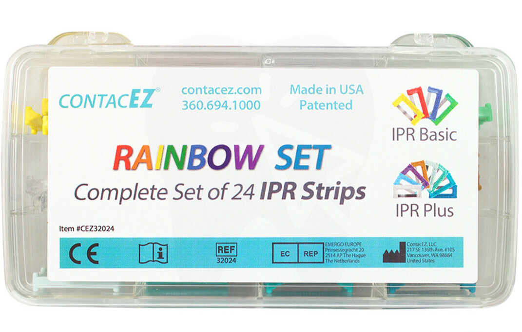 The ContacEZ IPR Rainbow Set includes an assortment of 24 IPR strips selected for the frequency of use and packaged together in a convenient storage case.