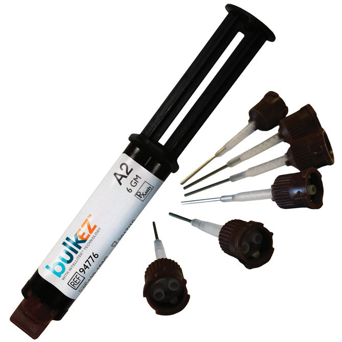 Bulk EZ is a dual cure dental restorative composite designed for direct restorations. The material starts as a flowable and once fully cured, will have similar physical properties as traditional light cure composites with high radiopacity. The self cure initiators allow Bulk EZ to have an unlimited depth of cure and make compatible with all methacrylate-based dental bonding agents.