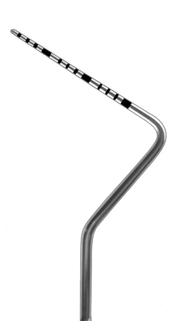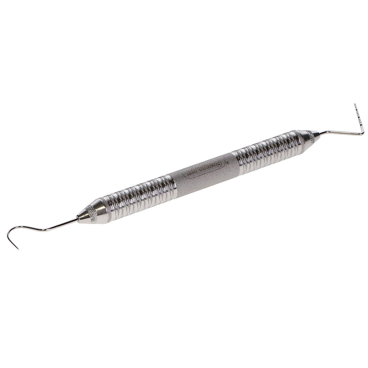 double ended instrument with an explorer on one end & a probe . for dental examinations & charting