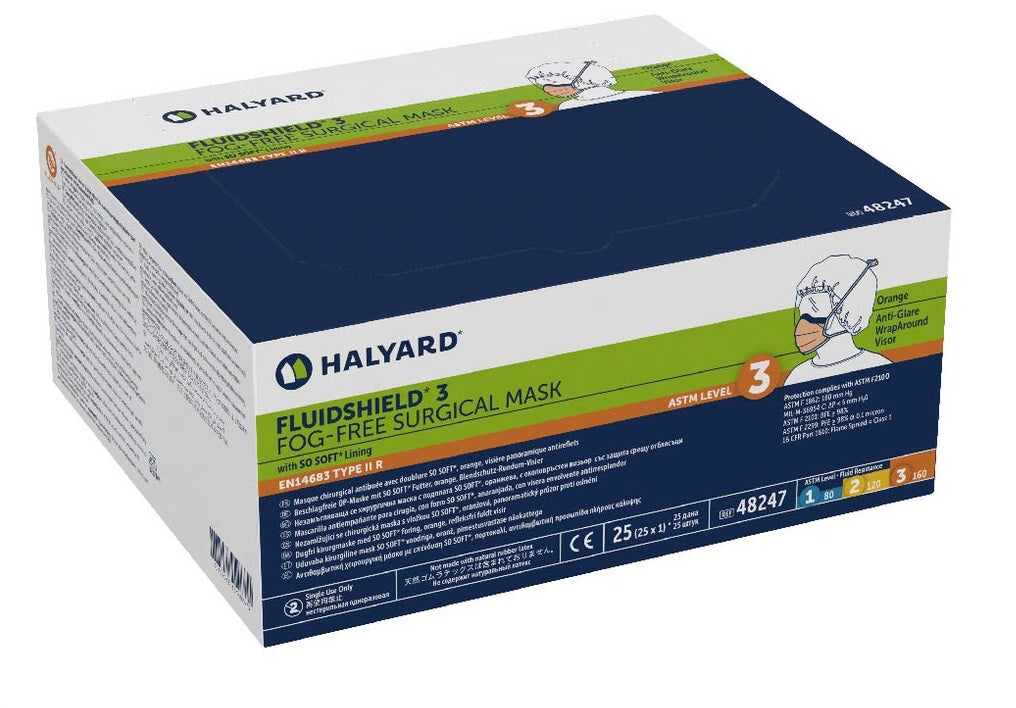 Halyard-FLUIDSHIELD* Level 3 Surgical Mask Anti-Glare with WrapAround Visor, 25/Box Orange #48247