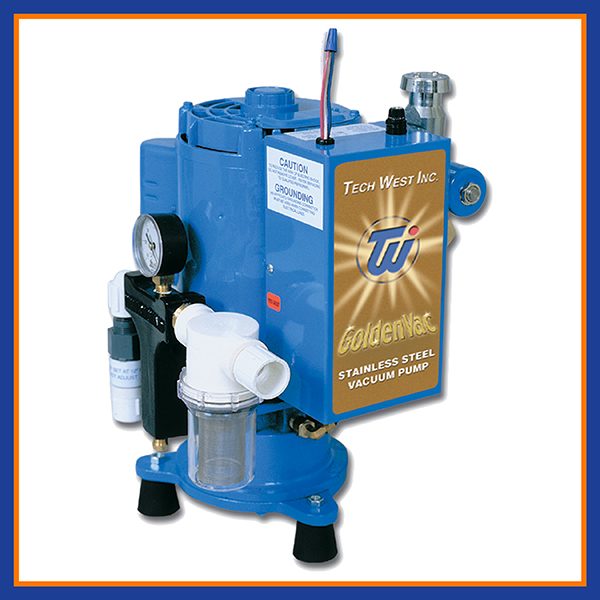 Tech West GoldenVac has proved to be the industry leader in design and performance. A vacuum system you can rely on for years to come. All GoldenVac vacuum pumps have an exclusive warranty with 10 years on all stainless steel pump components, 5 years on the motor shaft and all other components have 3 years. The GoldenVac vacuum pumps have an investment cast stainless steel impeller with a radical new design that improves performance by 20% over other pumps. The stainless steel castings provide maximum durability to prevent wear from air abrasion and ceramic particles, or hard water conditions. All motors are thermally protected and are cap-start, cap-run. This will lower the electrical consumption of the pump. Water recyclers and air-water separators are available for all pumps. The GoldenVacs are available in single, dual, or triple configurations. Tech West will provide plumbing and electrical designs upon request.