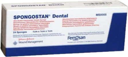Spongostan absorbable hemostatic gelatin sponge is a sterile, water-insoluble, malleable sponge intended for hemostatic use by applying to a bleeding surface. Spongostan will create a barrier together with fibrin which will stop the bleeding in 2–10 minutes and will be completely resorbed in 4–6 weeks.