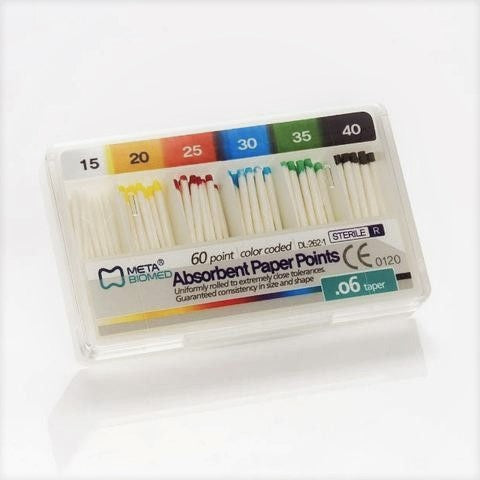 Meta Absorbent Paper Points are color-coded and spill proof Hand rolled for extra absorbency Rigid enough to insert in canals without curling or bending Rolled firmly to hold shape when withdrawn from the canal Highly absorbent Sterilized individual packages Variety sizes available.