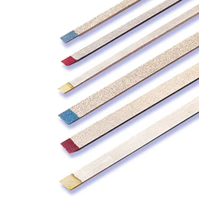 Two Striper Diamond Finishing Strips are thin, flexible, one sided diamond abrasive strips with an uncoated center for easy access through the contact point. These strips are ideal for finishing Class III, IV and veneer restorations. They are available in coarse, medium and fine grits in 2.5 mm and 3.75 mm widths in packages of 6.