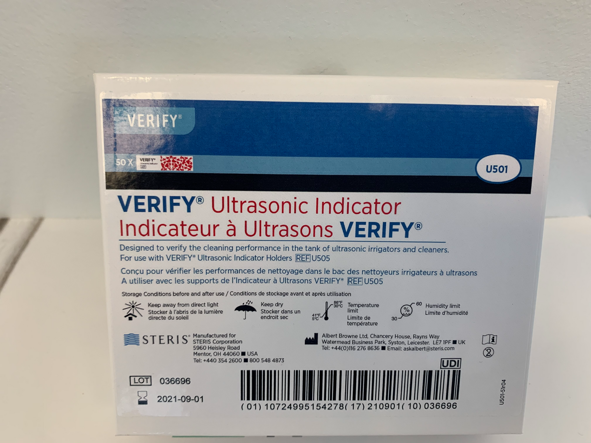 Ultrasonic cleaning uses cavitation, chemistry, time and temperature to effectively remove soils after manual cleaning. The VERIFY Ultrasonic Indicator provides an independent objective test to evaluate the ultrasonic cycle. Problems such as insufficient energy, water level, improper temperature and degassing may have an impact on the results.