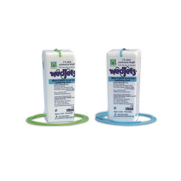 Wedjets Cord is a faster, easier method of retaining dental dam than stainless steel clamps. Wedjets is a stretchable cord . This cord is placed like dental floss to hold the dental dam in place during treatment. Available in small and large sizes, Wedjets is easier to apply than floss, is disposable, and dispenses just like floss. Wedjets can reduce patient trauma and discomfort caused by metal clamps.